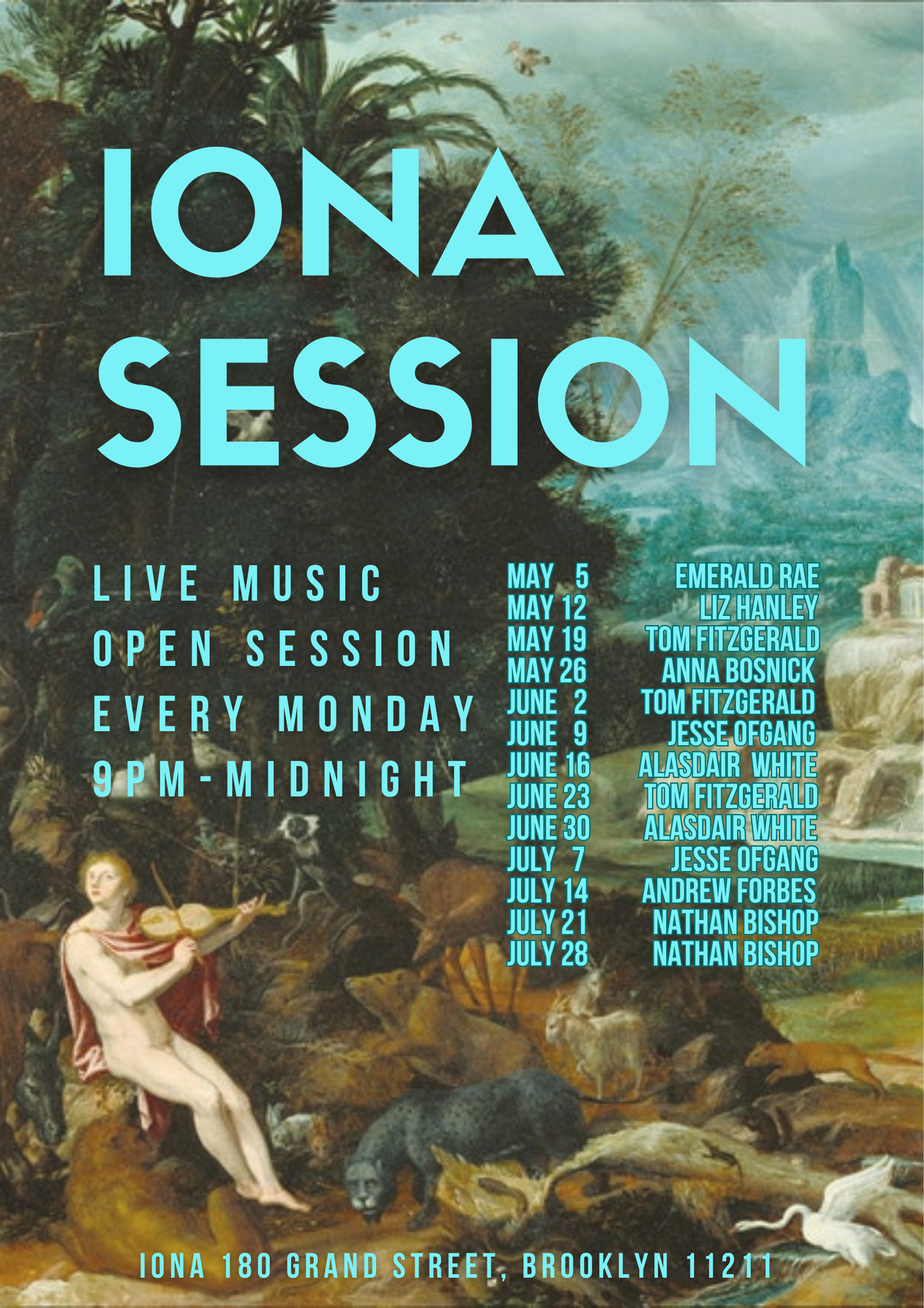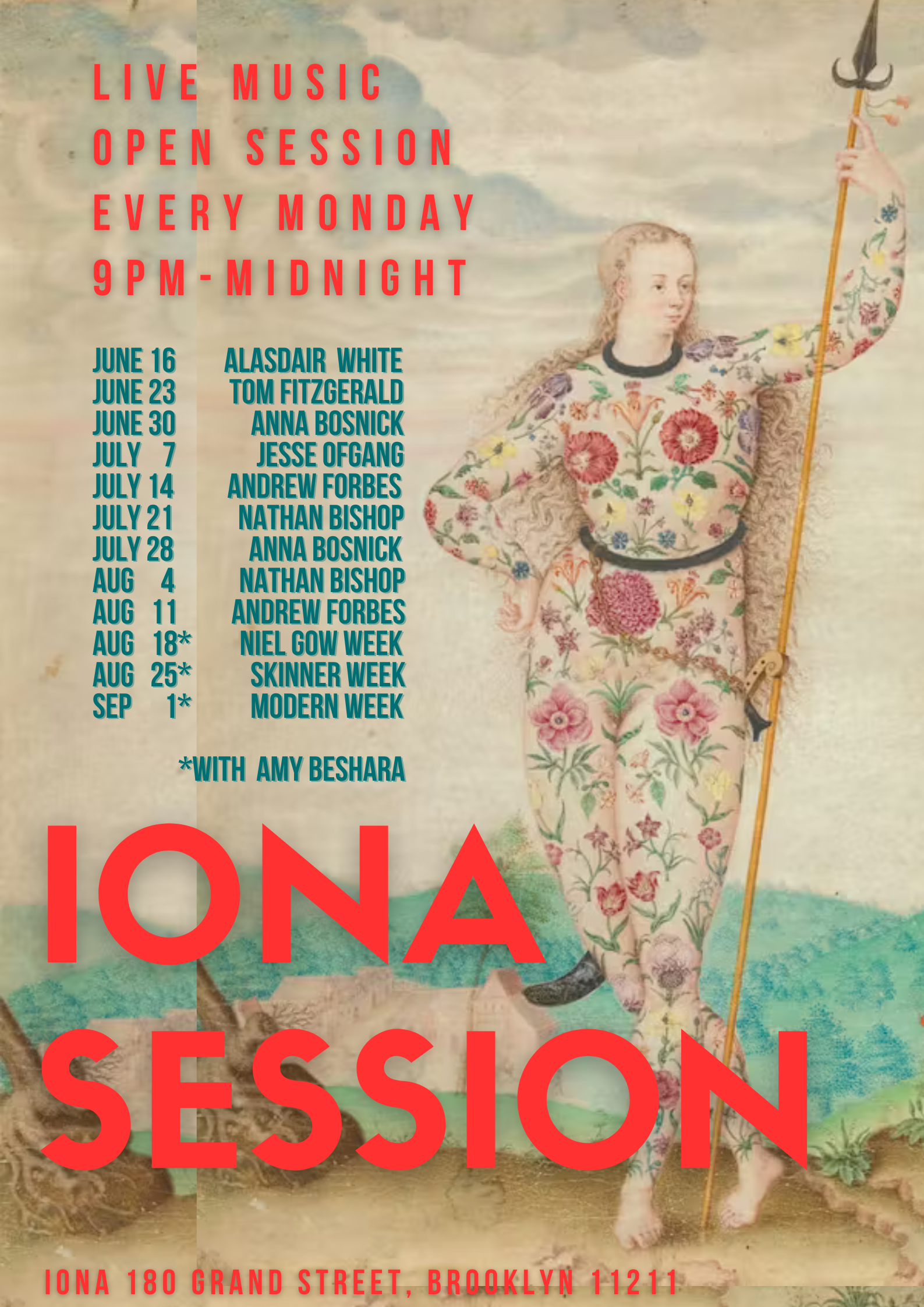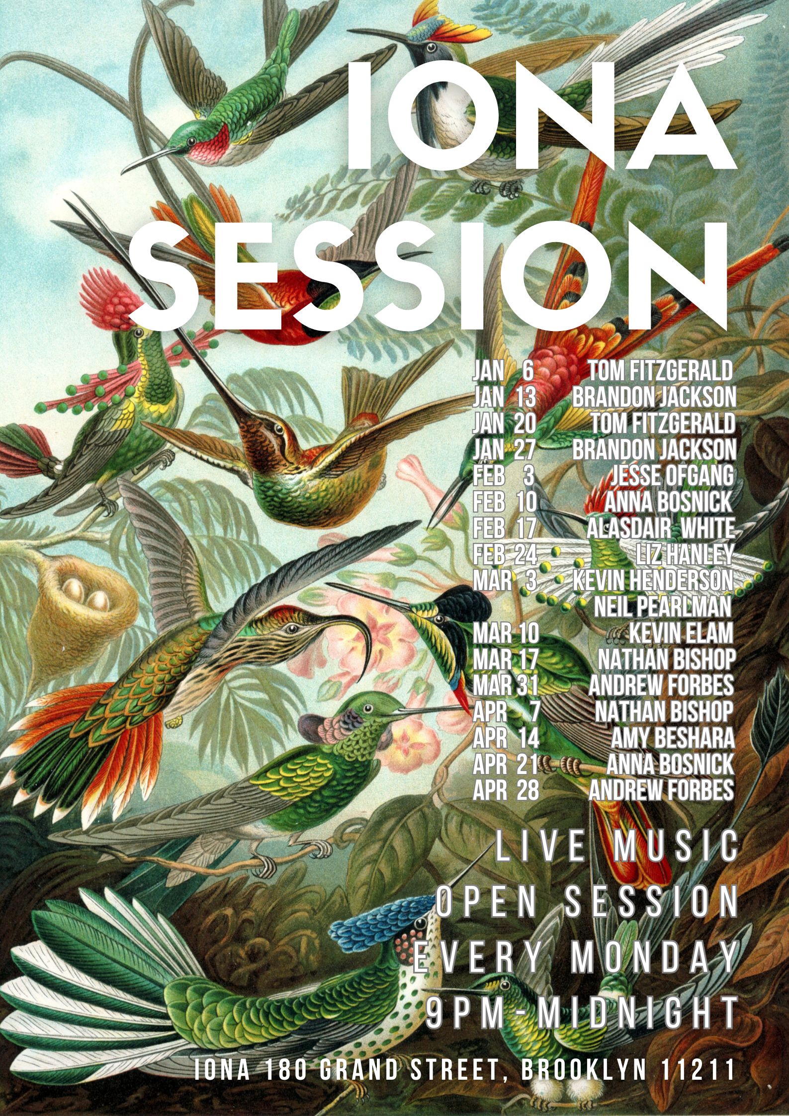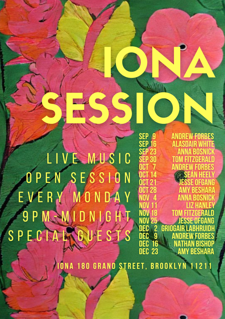 Join us on Monday nights, 9-12 at 180 Grand Street Brooklyn for the Iona Session. Special guests every week and a warm welcome for all.