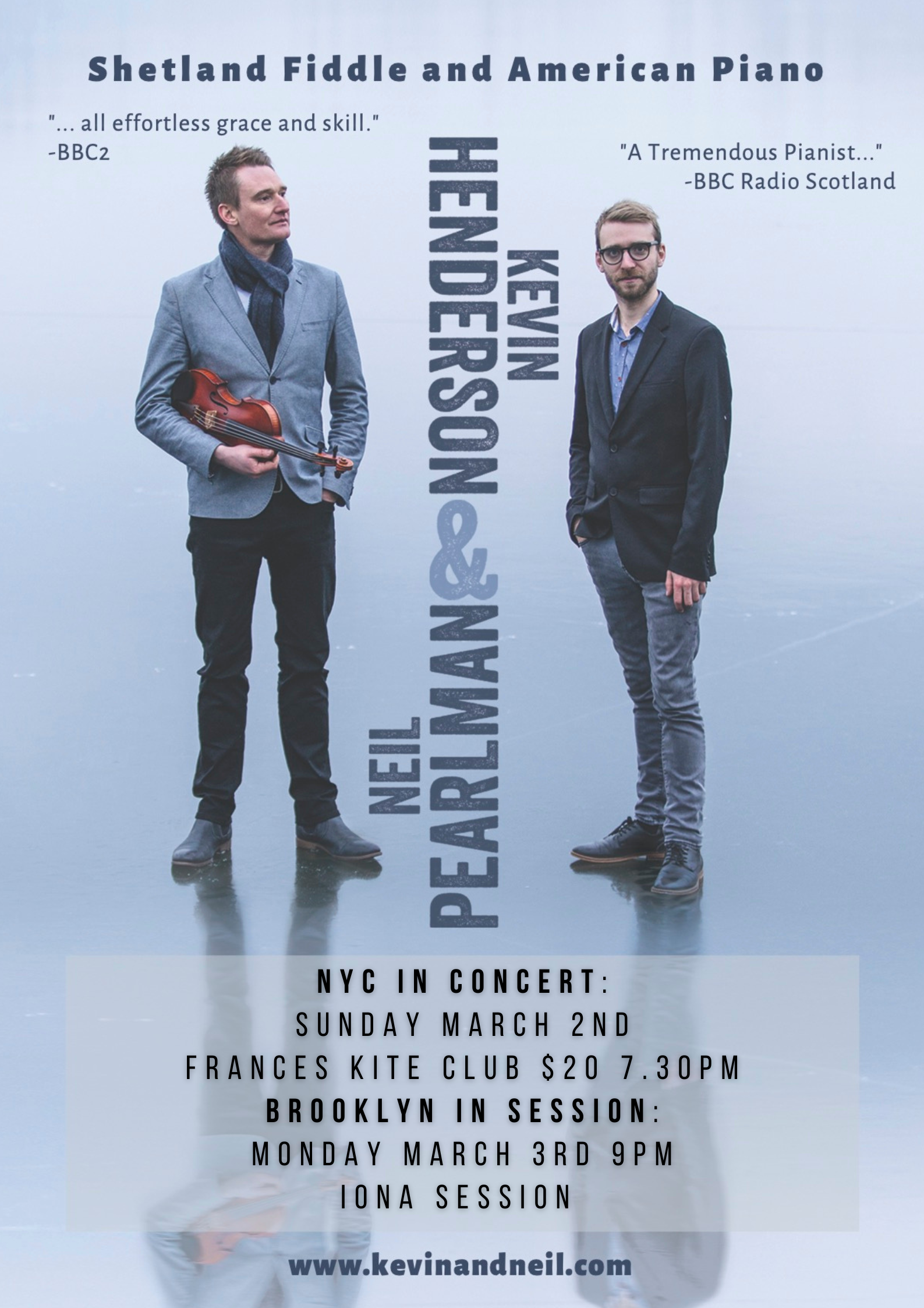 Kevin Henderson and Neil Pearlman are hitting NYC this weekend, playing a show at Frances Kite in Manhattan on SUNDAY NIGHT MARCH 1ST onstage at 7.30 and then joining us for the Iona Session in Brooklyn on Monday 3rd at 9pm. They are a superb duo in concert, energy jumping off from one to the other. Spread the word, hope to see fans of consummate trad at the shows…all the details at the link below and what a treat to have them at the session.